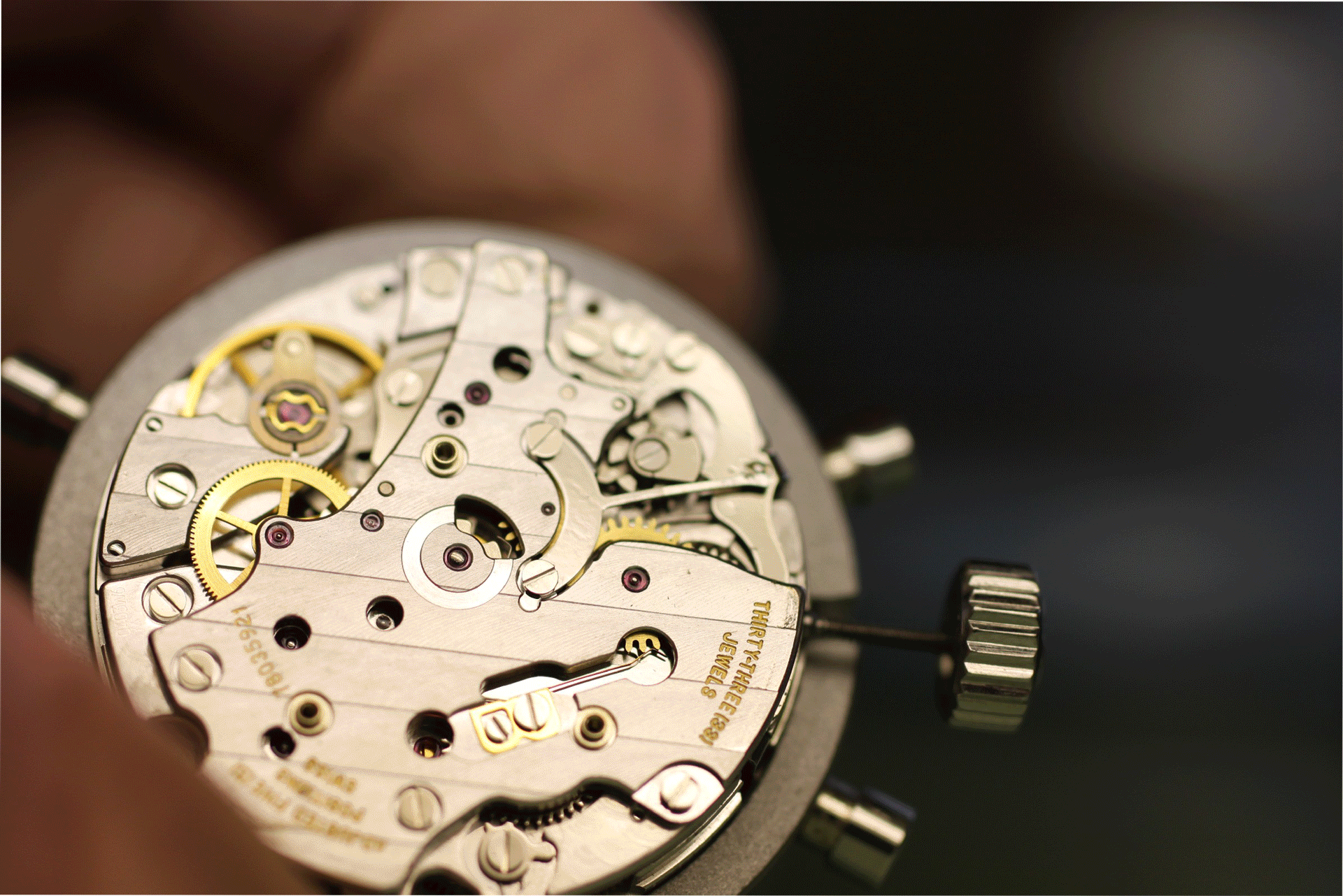Das Minutenzählerrad muss bei laufendem Chronograph (hier falsches Bild) einmal durchgeschaltet werden, ohne dass der Finger des Chronozentrumrads im Eingriff mit dem Übertragungsrad steht. Im gereinigten Zustand muss hierbei jeder Zahn sauber geschaltet werden, falls nicht muss entweder die Spannung der Minutenzählerraste (goldene Feder) erhöht werden, oder die Ursache für den hohen Drehwiderstand des Minutenzählers gefunden werden.