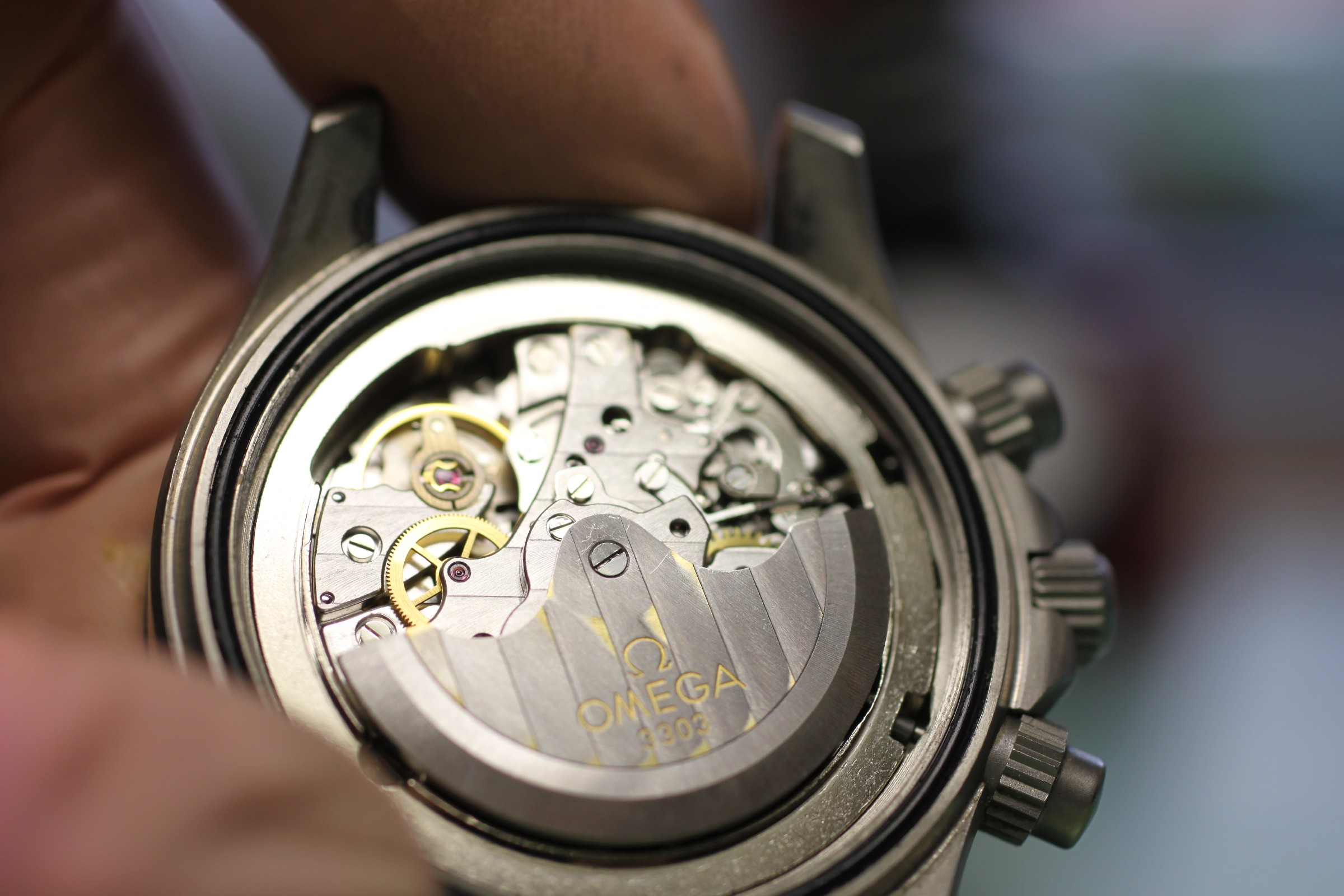 Nachdem die Zeiger gesetzt wurden, werden erneut alle Chronographenfunktionen geprüft. Das Gehäuse wurde zwischenzeitlich aufgearbeitet und gereinigt. Jetzt kann die Uhr wie üblich eingeschalt werden und die Prüfungen für Automatik, Gangreserve und Gang durchlaufen.