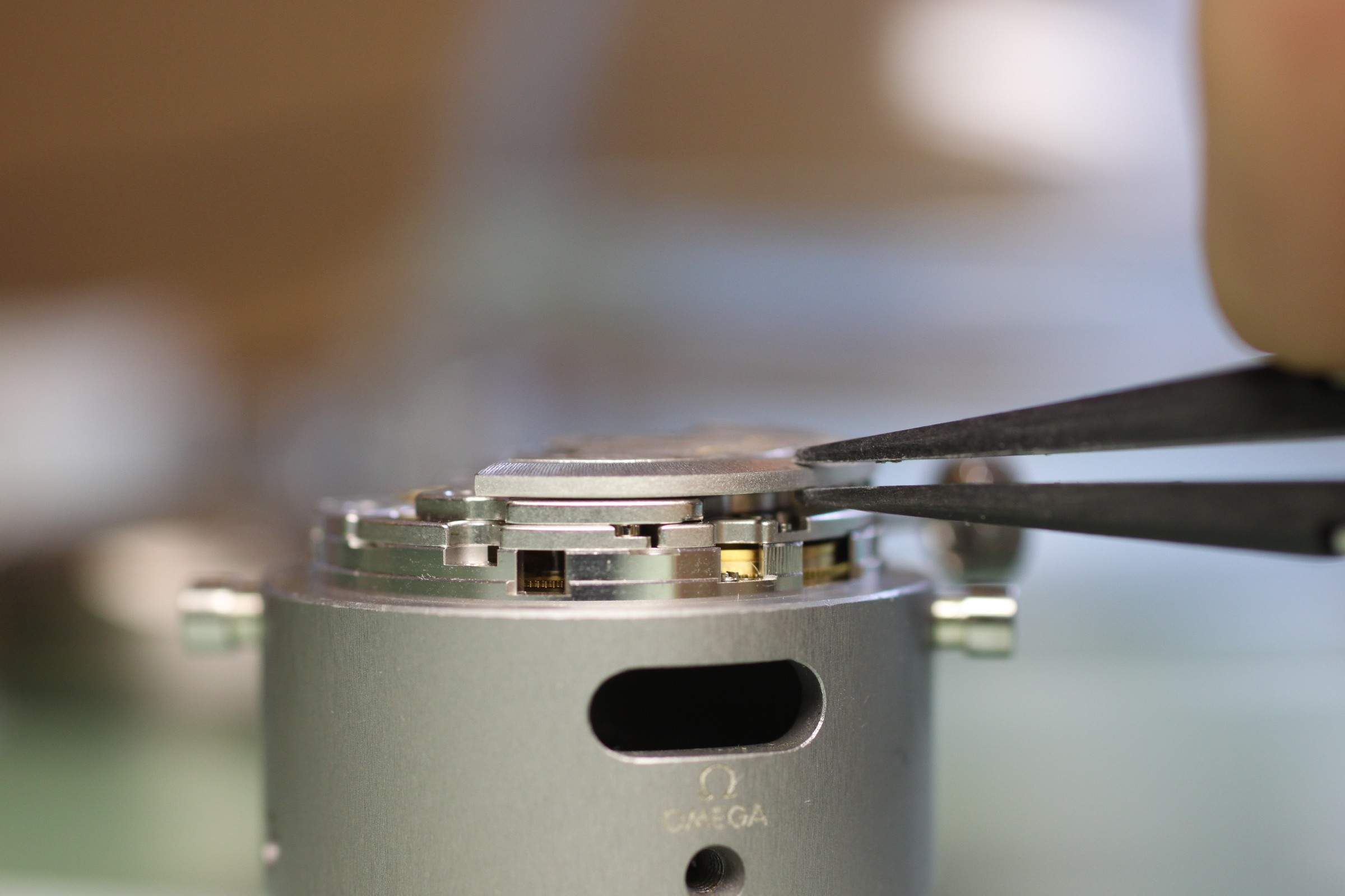 Die Bauteile der Automatik. Die Langlöcher für das Schwingtrieb laufen „gerne“ ein. Bei der Montage sollte man sich genau an den Schmierplan von Omega halten, zuviel Öl oder Öl an der falschen Stelle führt zu einer geringen Aufzugskraft der Automatik.