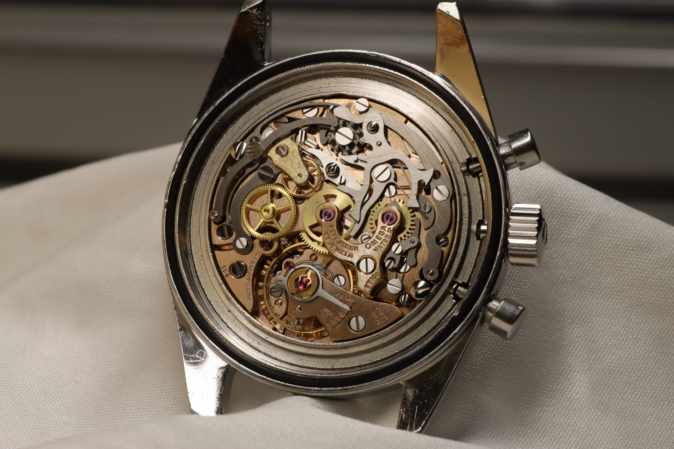 Komplette Wartung mit Feinrevision, Wasserdichtigkeitsservice, Gehäuseaufarbeitung, nachschwärzen der Schrift im Gehäuseboden und neuem Glas einer Omega Speedmaster Professional Ref. 145.0022 Kaliber 1861