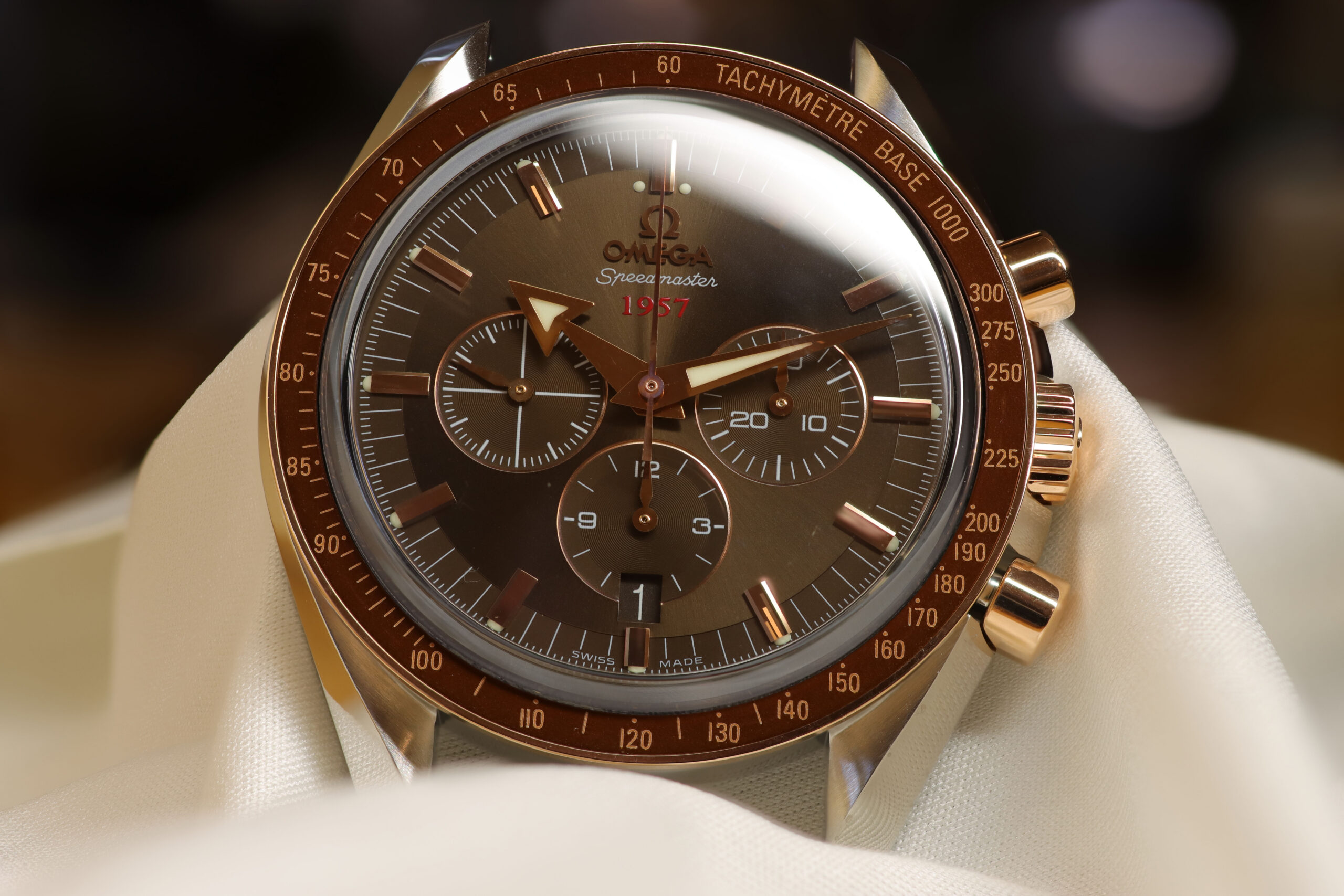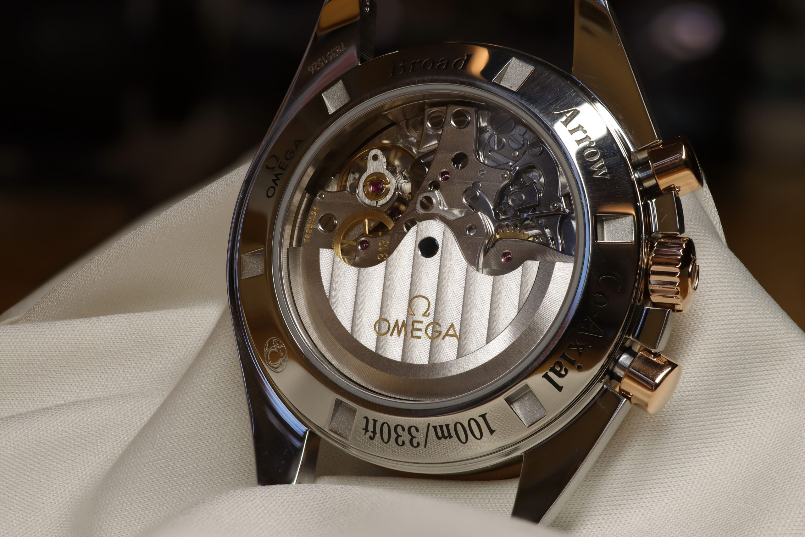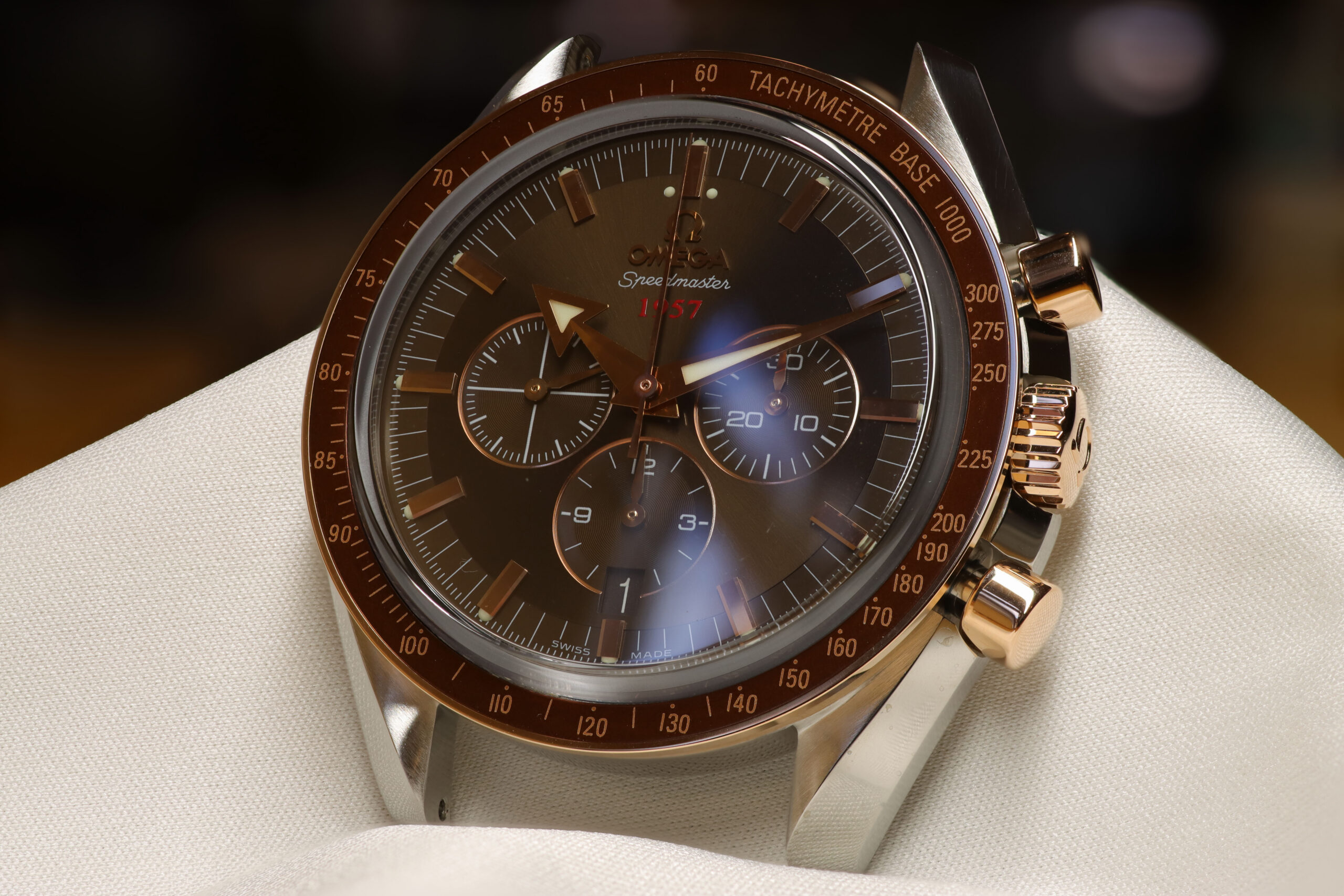 Omega Speedmaster in Stahl-Rotgold mit Massivgold Lünette, Krone, Drücker und Zeiger sowie Indexe.